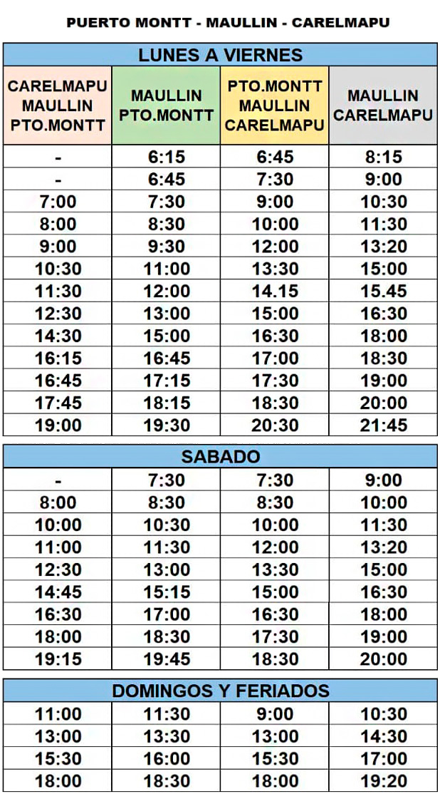 A continuación, encontrarás una tabla detallada con los horarios de salida y llegada de la ruta Puerto Montt - Maullín - Carelmapu. Nos esforzamos por mantener una programación precisa y actualizada para que puedas organizar tu viaje con total tranquilidad.